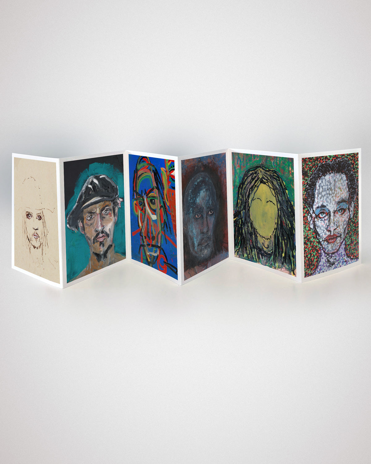 この6枚の蛇腹式ポストカードの中には、ジョニー・デップによるポートレートが収められています。自画像でしょうか?いくつかは特に謎めいています。厳選されたこれらの作品は、彼の愛する鮮やかな色彩から、衝動的な絵の具の飛び散り、荒々しい線まで、このアーティストの多様な創作手法と技法を余すところなく示しています。何よりも、ジョニーがさまざまな肖像画スタイルを通じてその形と、個性を描き出す能力をいかに磨いてきたかがわかります。